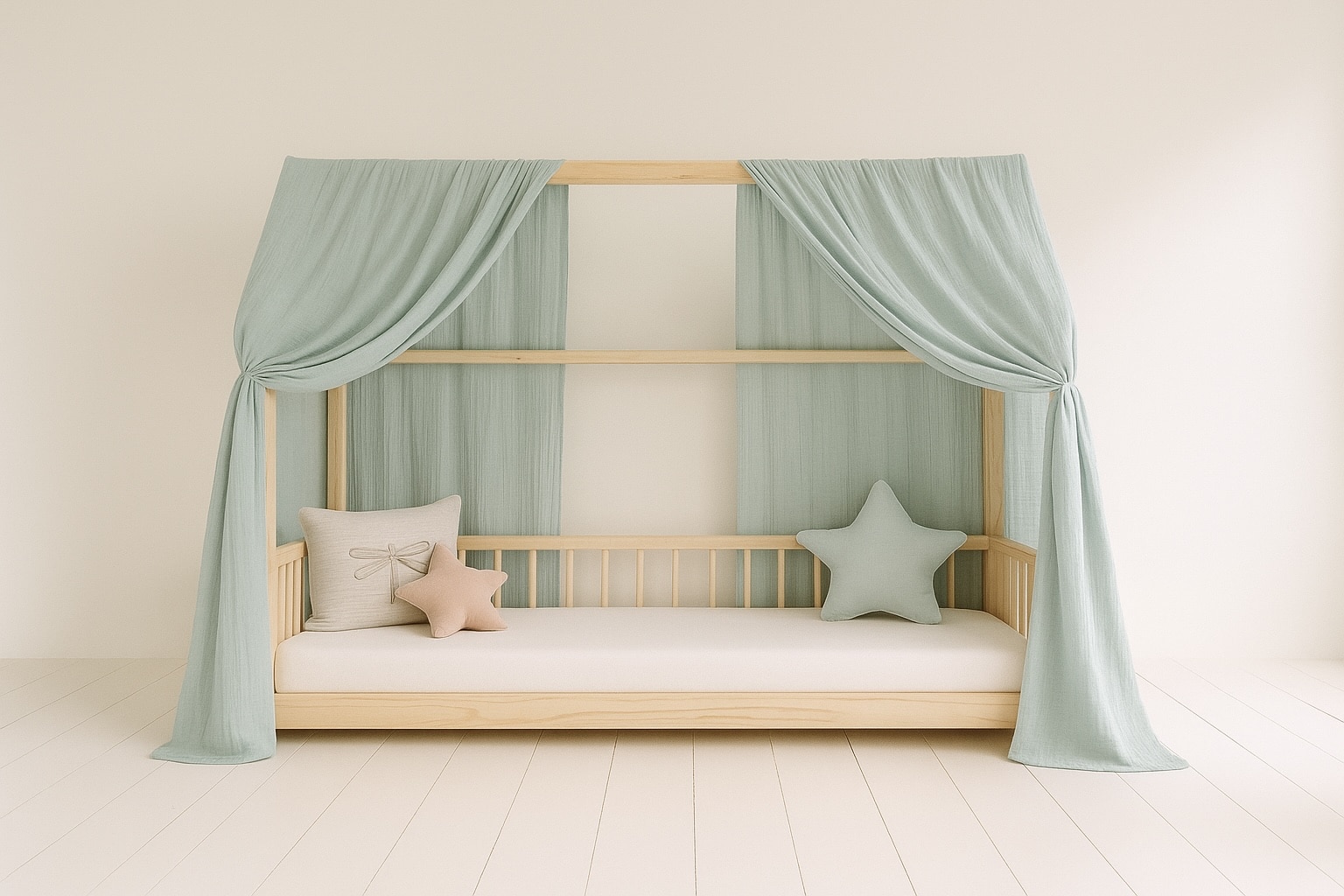 ✨ Le ciel de lit vert d’eau est bien plus qu’un accessoire déco : il crée un espace rassurant et stimule l’imaginaire des enfants, tout en apportant une touche naturelle et élégante à leur univers.