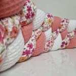 Tissus utilisés pour cette tresse : corail | blanc | nid d’abeille fleuri | nid d’abeille fleuri