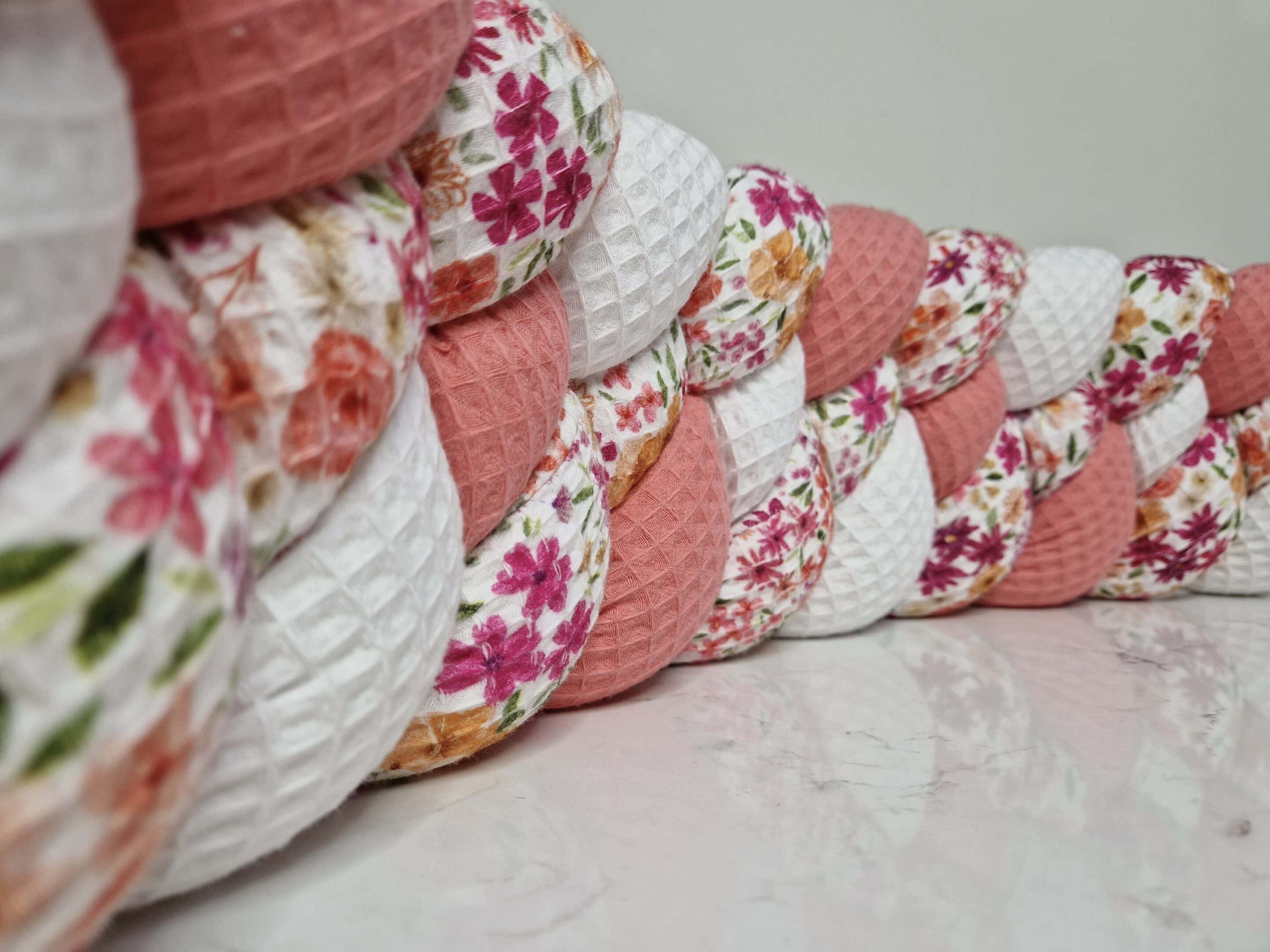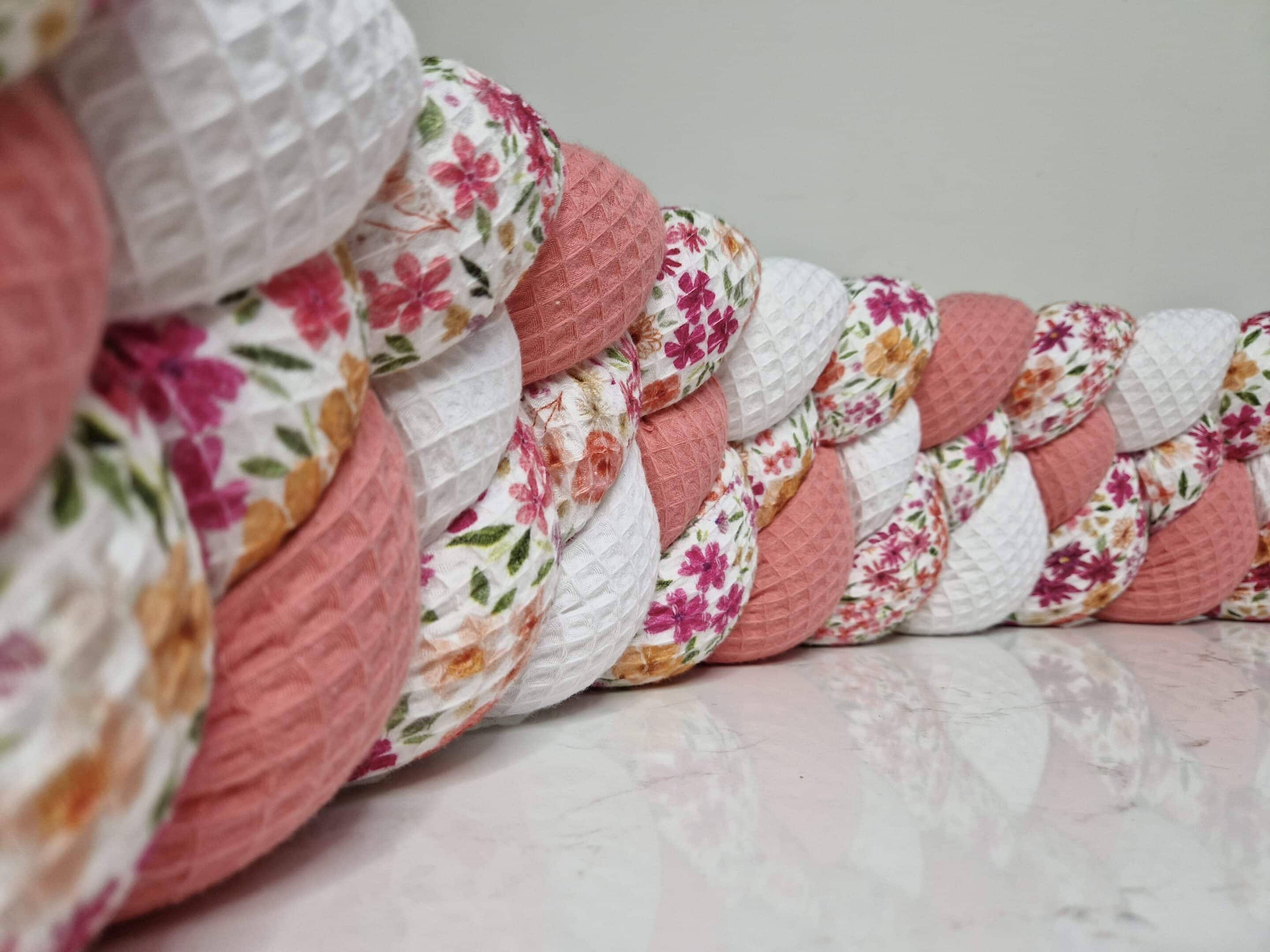 Tresse de lit 4 brins – Corail et nid d’abeille fleuri – Tour de lit tressé