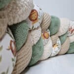 Cela dépend de l’endroit où vous souhaitez la mettre. Pour un lit bébé standard (60 x 120), une tresse de 200 cm fera un U sur la moitié du lit. Une tresse de 300 cm fera un U remplissant les 3/4 du lit. Pour le tour complet, comptez 350 cm. Pour savoir les dimensions dont vous avez besoin, mesurez le contour du lit ou du parc. Additionnez ces mesures pour connaître la taille qu’il vous faut. Un Guide des tailles les plus courantes est disponible plus haut, près des bulles de tailles.