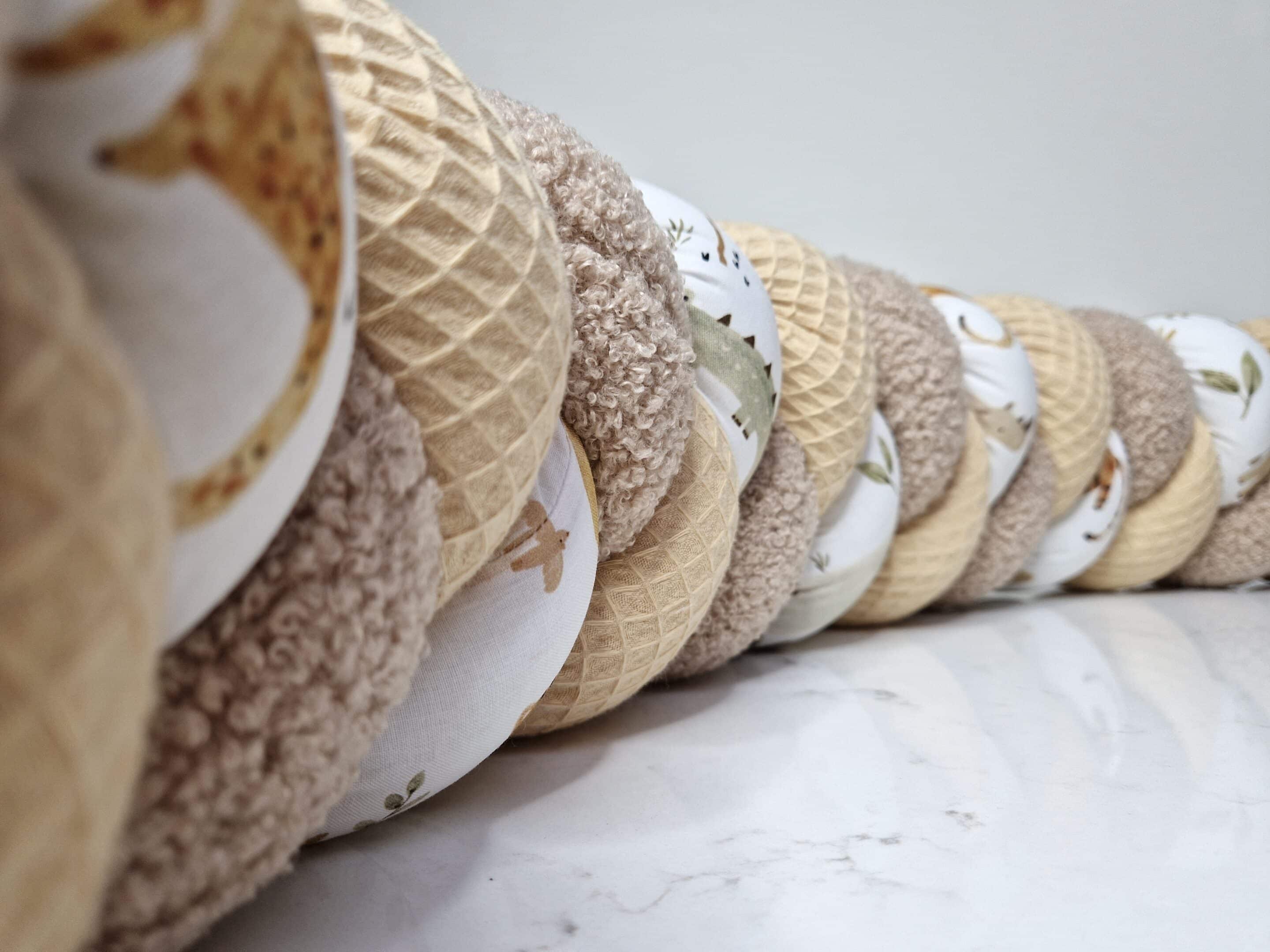 Tresse de lit pour bébé et enfant – faite main en Belgique, conçue pour sécuriser le sommeil de votre enfant tout en décorant sa chambre. Disponible en plusieurs couleurs et tailles, cette tresse est fabriquée en coton certifié Oeko-Tex avec rembourrage respirant.