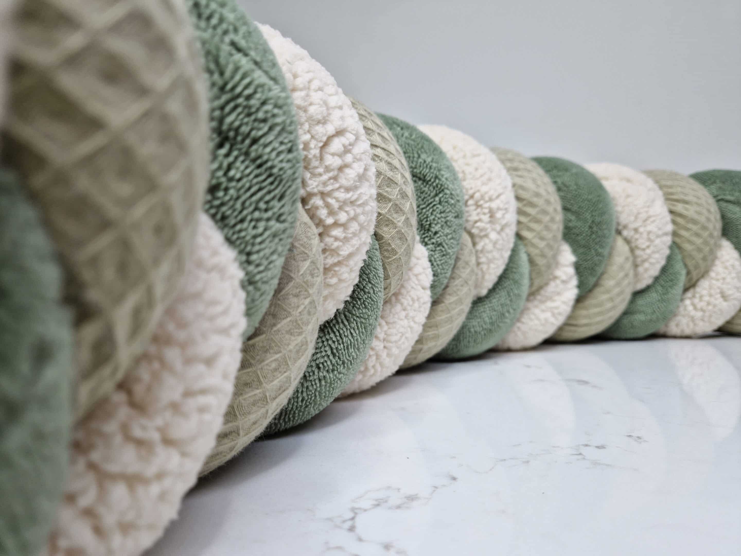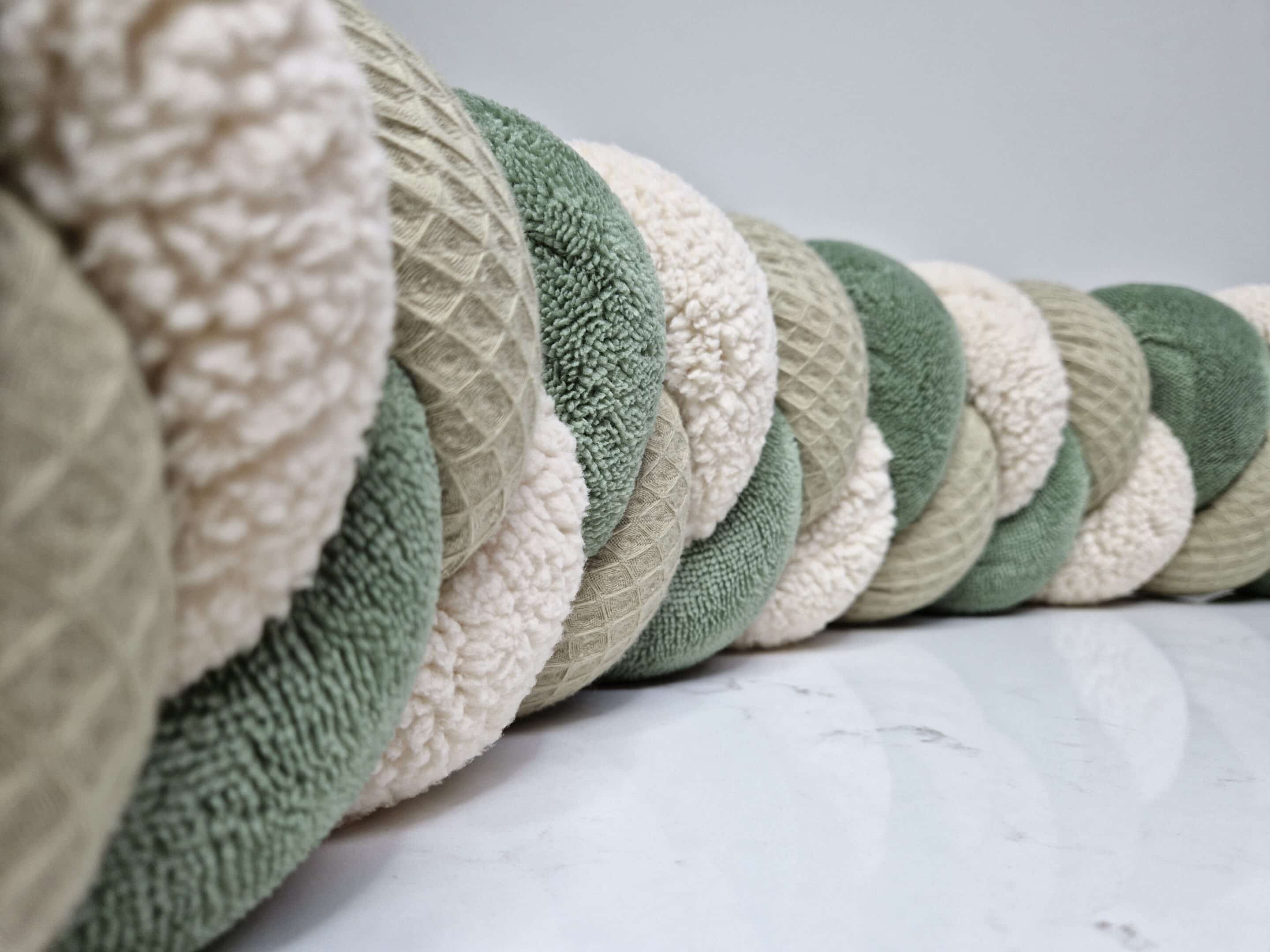 Tissus utilisés pour cette tresse : doudou romarin | nid d’abeille olive clair | sherpa écru