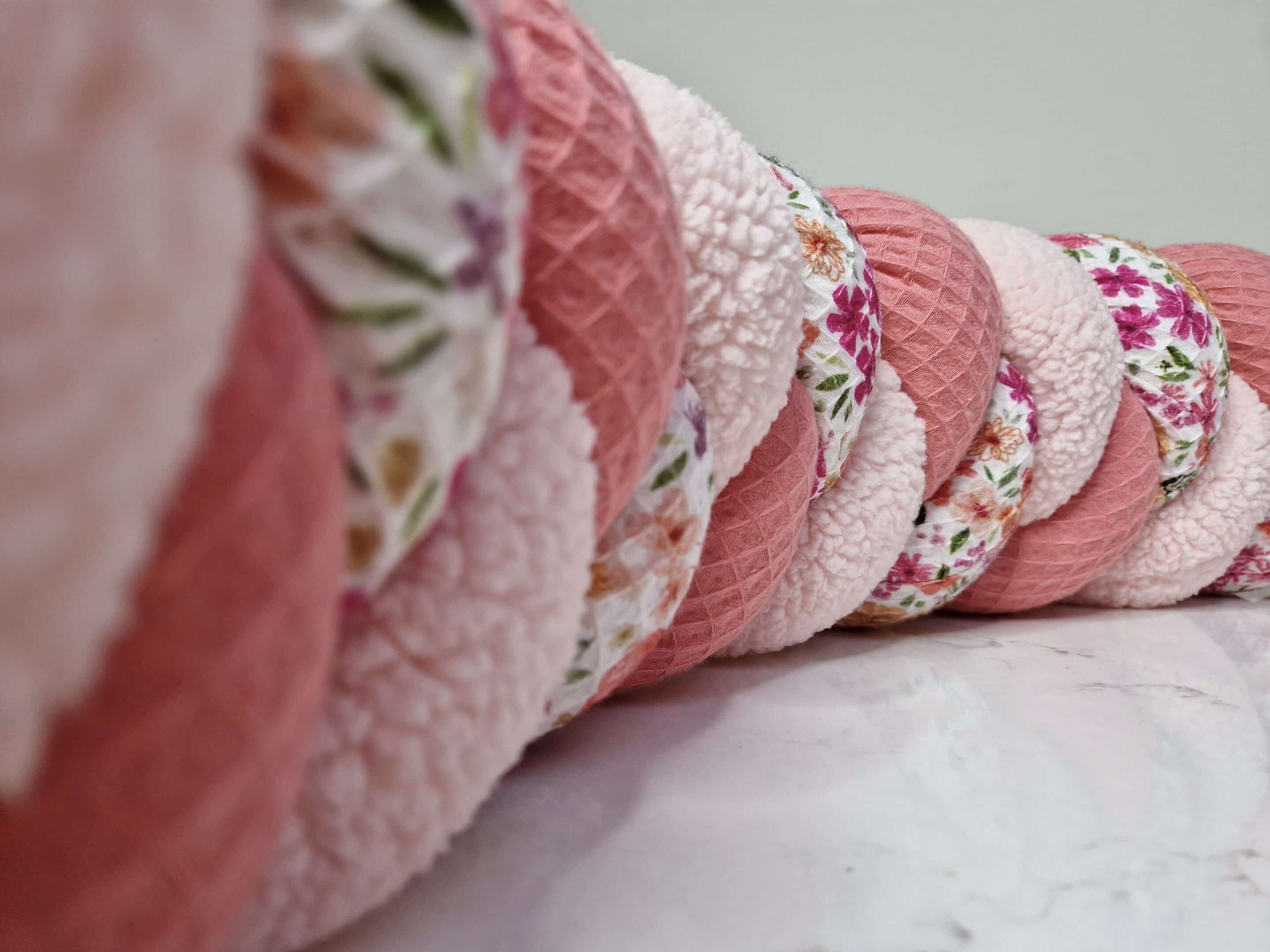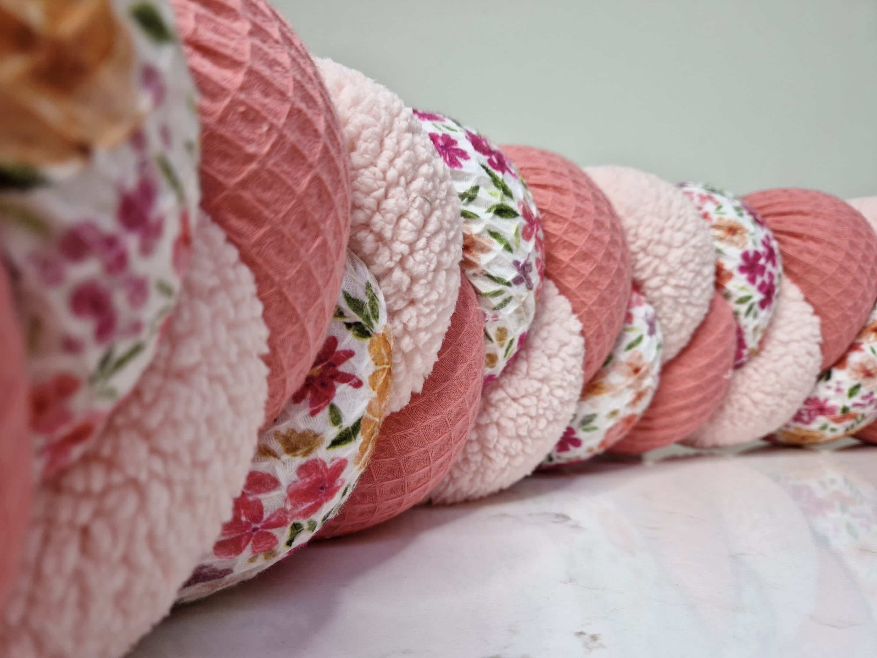 Tissus utilisés pour cette tresse de lit : sherpa rose | nid d’abeille corail | nid d’abeille fleuri