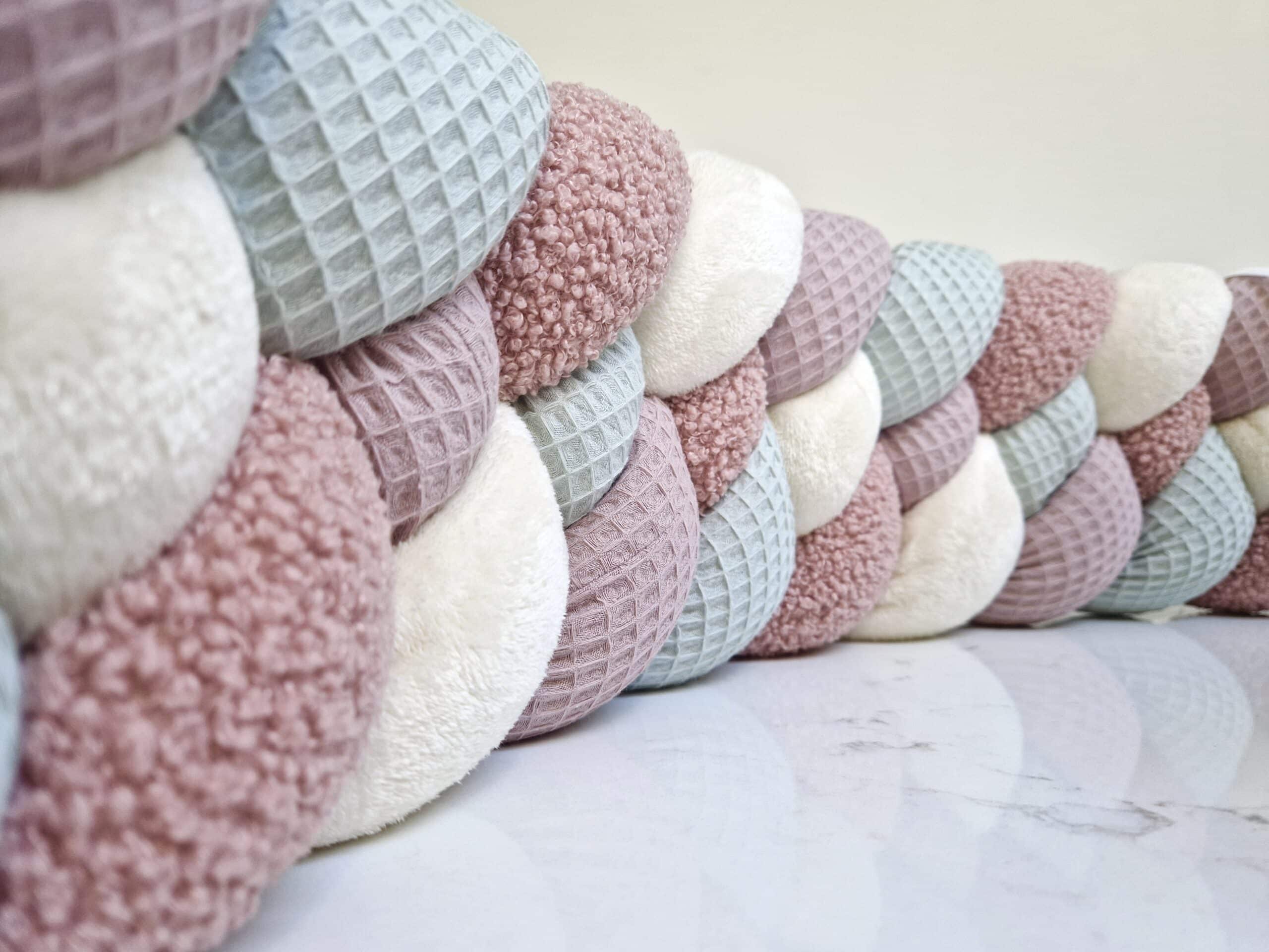 Tresse de lit – Vert d’eau, teddy rose et écru – Tour de lit tresse